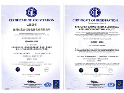 任達(dá)電器通過(guò)ISO9001 質(zhì)量管理體系認(rèn)證,2000年通過(guò)改版認(rèn)證。