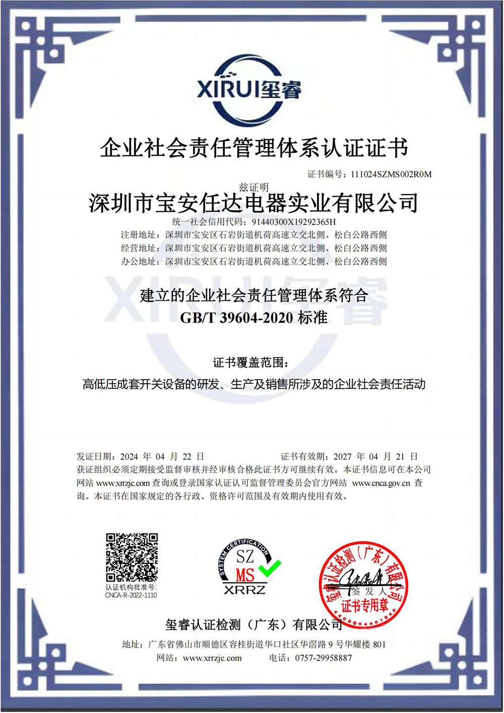 企業(yè)社會責任體系認證證書是企業(yè)踐行可持續(xù)發(fā)展戰(zhàn)略的標準化工具,其核心在于將環(huán)境、社會及治理(ESG)要素整合至運營全流程。該認證通過第三方機構(璽睿認證檢測(廣東...